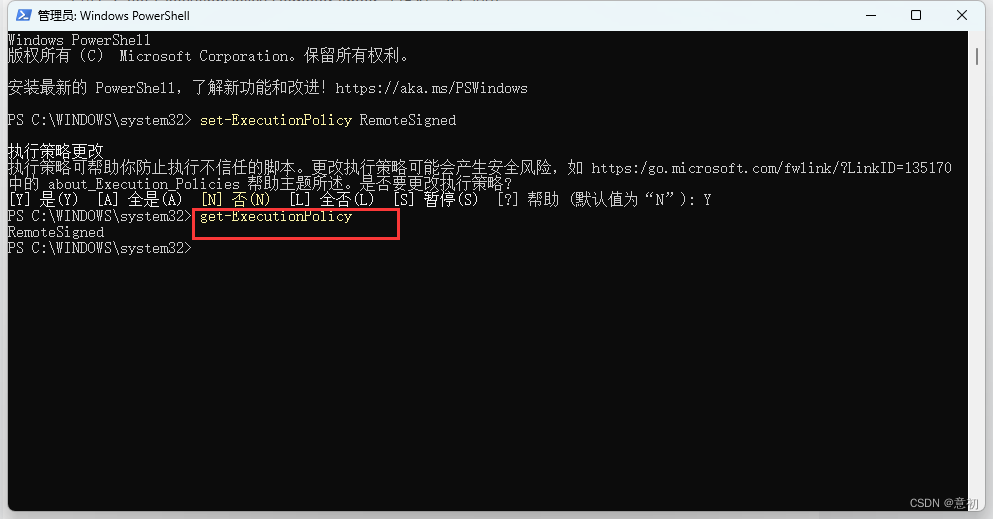 3.查看执行策略:get-ExecutionPolicy 查看是否为RemoteSigned