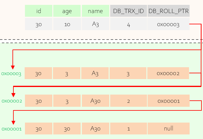 不同事务或相同事务对同一条记录进行修改,会导致该记录的undo log生成一条记录版本链表,链表的头部是最新的旧记录,链表尾部是最早的旧记录。