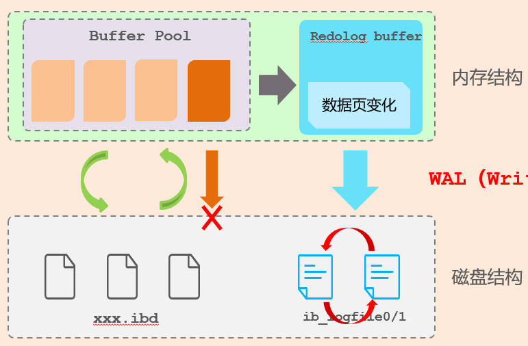 主内存中的一个区域,里面可以缓存磁盘上经常操作的真实数据,在执行增删改查操作时,先操作缓冲池中的数据(若缓冲池没有数据,则从磁盘加载并缓存),以一定频率刷新到磁盘,从而减少磁盘IO,加快处理速度。