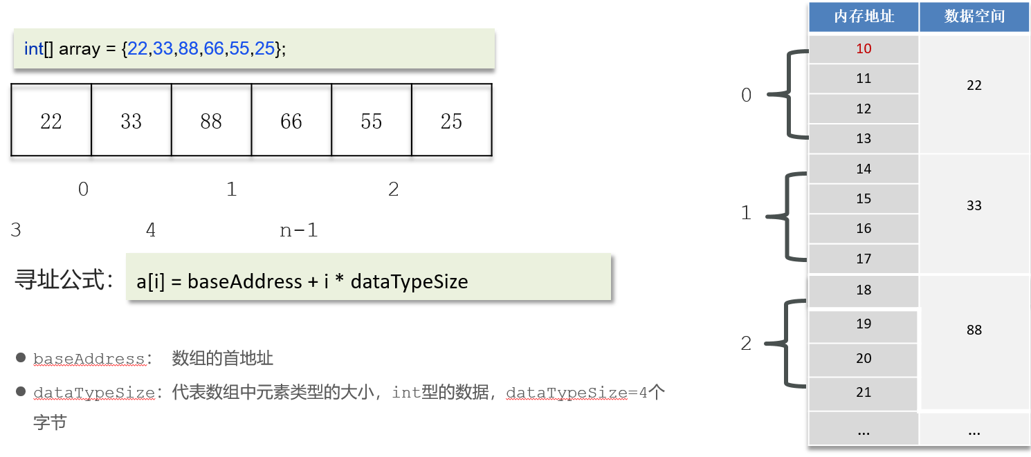 寻址公式是:baseAddress+ i * dataTypeSize,计算下标的内存地址效率较高。
