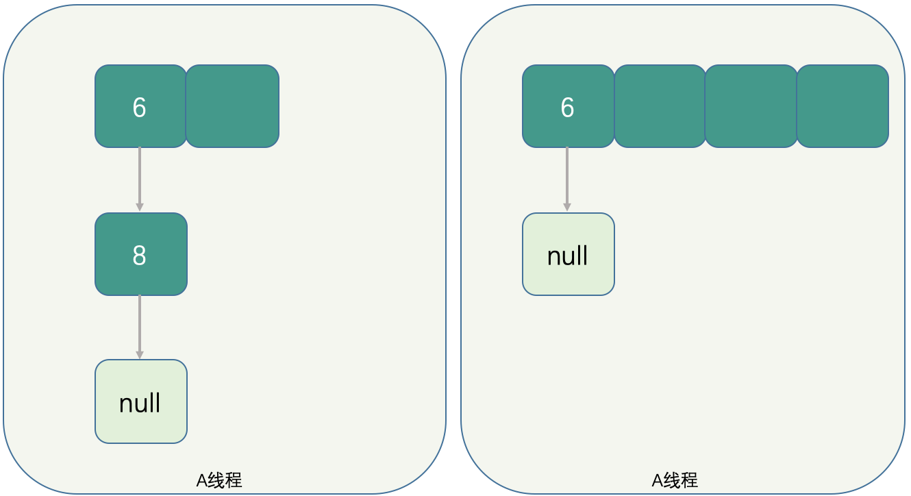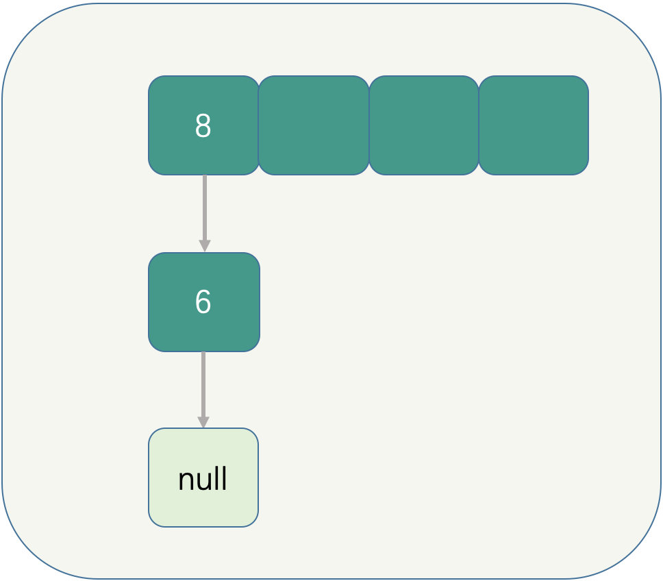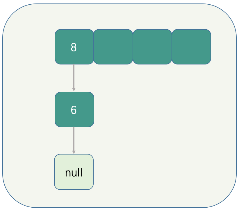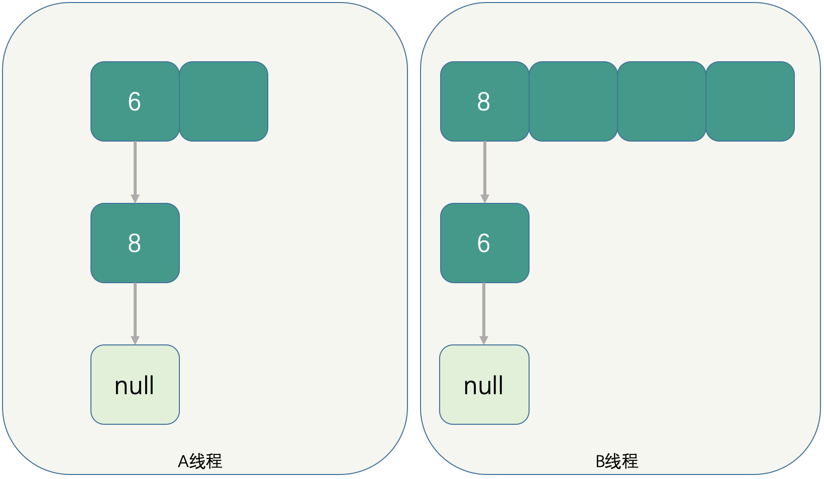 接着B线程开始进行扩容,假设新的散列表中,节点6 和 节点8 还是会产生散列冲突,那么线程B的扩容过程为: