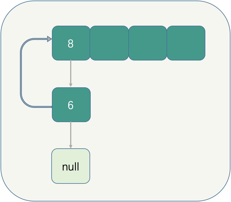 回顾一下线程A的当前状态:e = 6; next = 8;,处于挂起状态。接着A线程取消挂起状态,接着执行(关键代码)之后的代码:将e = 6;节点迁移至新的散列表,并将next = 8的节点赋值给e。扩容并迁移节点6后的状态,如下图所示:
