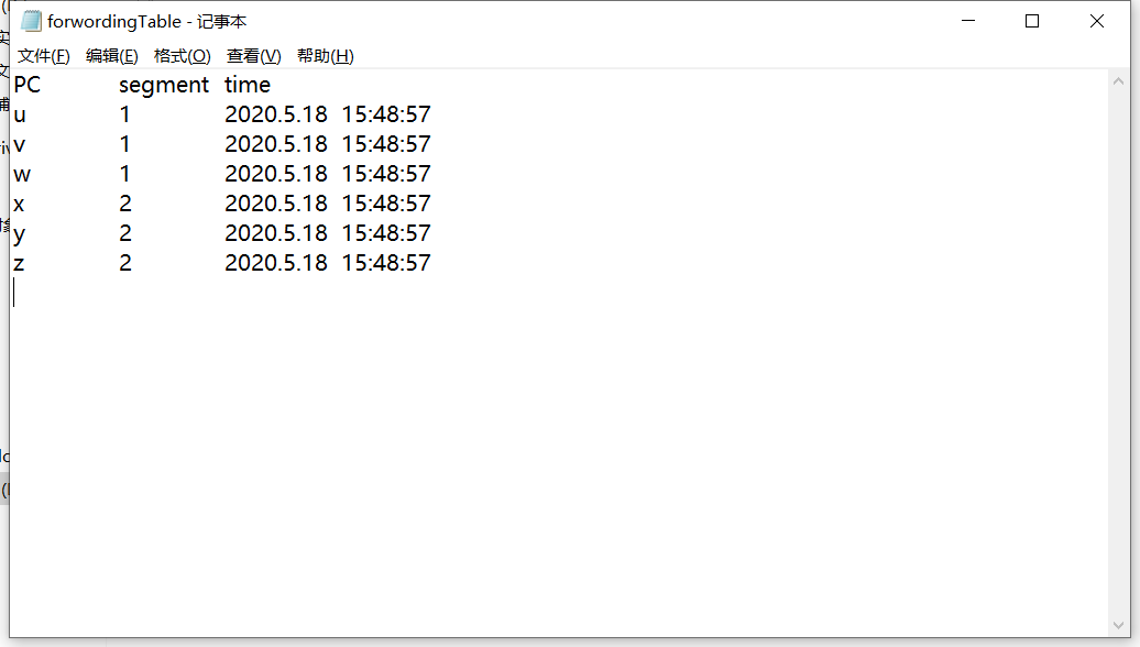 forwordingTableFileWrite << "PC\tsegment\ttime" << endl;