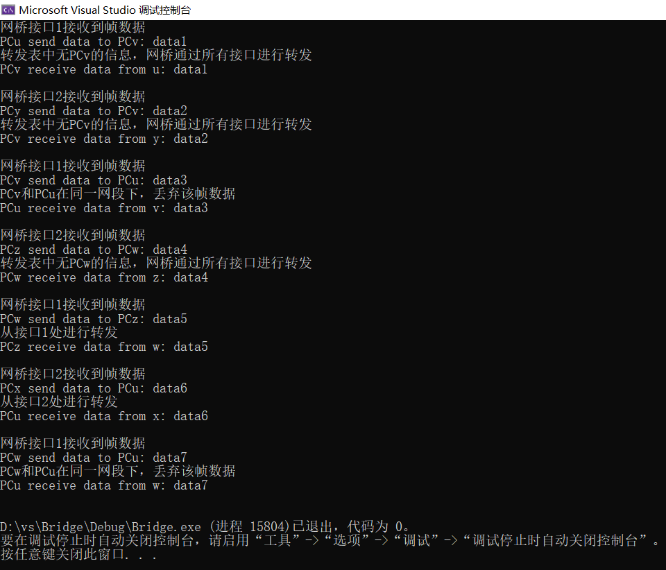 模拟实现网桥的转发功能,以从文件中读取帧模拟网桥从网络中收到一帧,即从两个文件中读入一系列帧,从第一个文件中读入一帧然后从第二个文件中再读入一帧,如此下去。对每一帧,显示网桥是否会转发,及显示转发表内容。