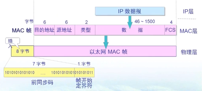 - MAC层下传物理层还要在帧前面插入8个字节,7个字节的前同步码,1个字节的帧开始定界符