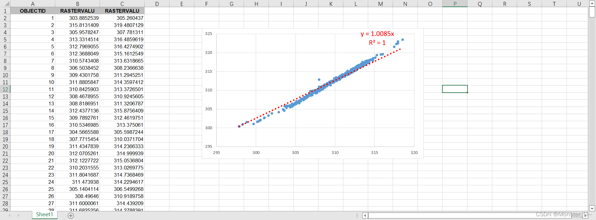 通过两种不同方法计算得到的地表温度遥感影像图,对其进行采样、相关性分析。