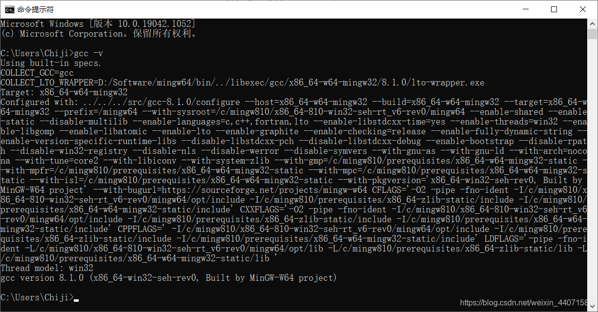 验证是否添加成功:按win+R运行cmd,输入gcc -v按回车,如果出现如下图所示信息,则表示添加成功,否则添加失败,需要重新添加。