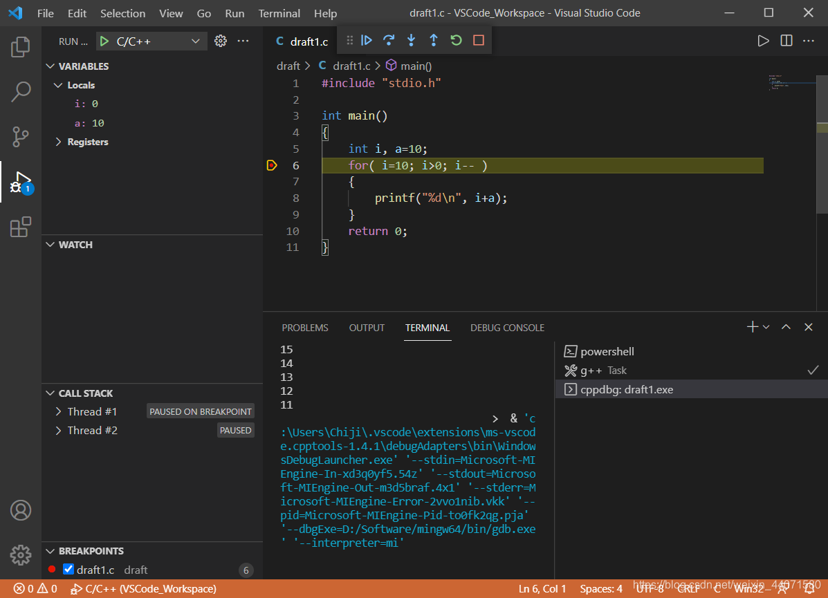 到这里就已经实现VSCode编译C/C++程序的功能。使用快捷键F5或点击Run->Start Debugging便能够调出程序调试功能。
