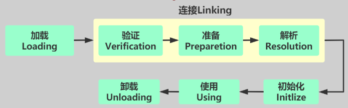 类从被加载到虚拟机内存中开始,到卸载出内存为止,它的整个生命周期包括:加载、验证、准备、解析、初始化、使用和卸载七个阶段。它们的顺序如下图所示: