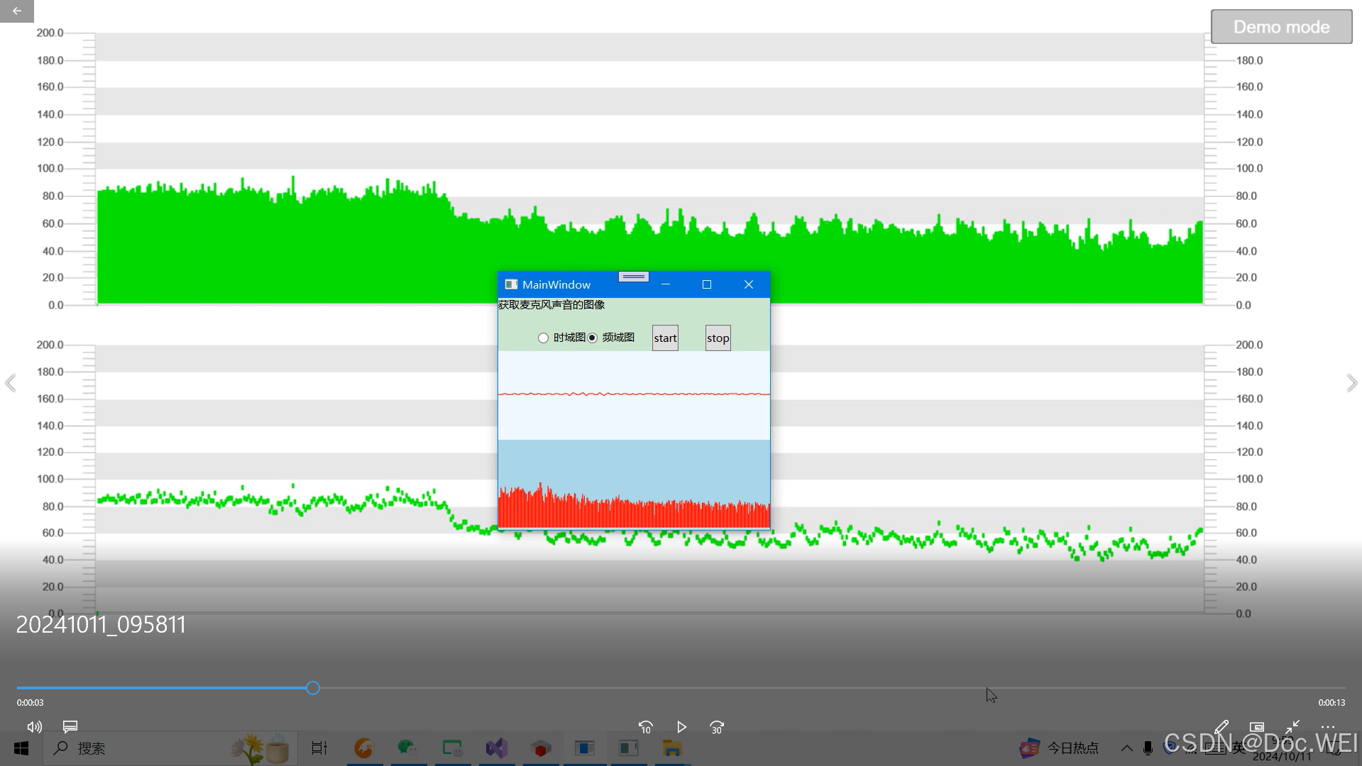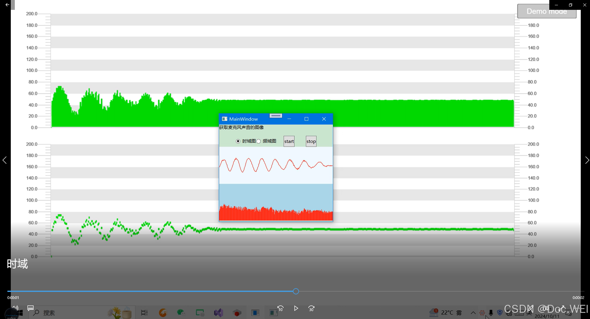 以下图形分别是在时域和频域模式下采集的数据(小窗口是C#采集的),通过图形可以看到,在如此高频的动态数据下,数据传输还是有一定的实时性的,时域存在一定的延迟,频域的数据缺失较明显。