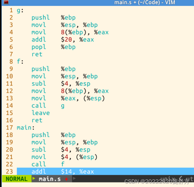 6.打开main.s,main.s汇编文件还有一些“.cfi_”打头的字符串等等。简化一下代码,在VIM中,使用“g/\.s*/d”命令可以获得简化的汇编代码。