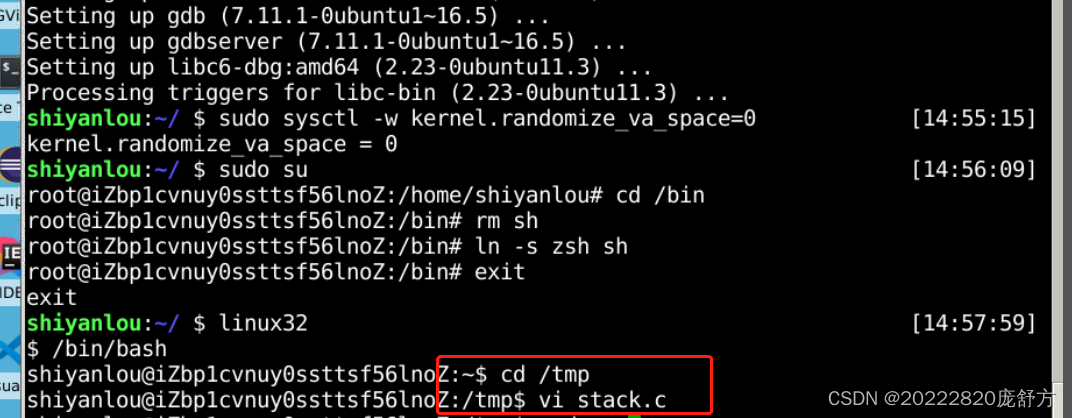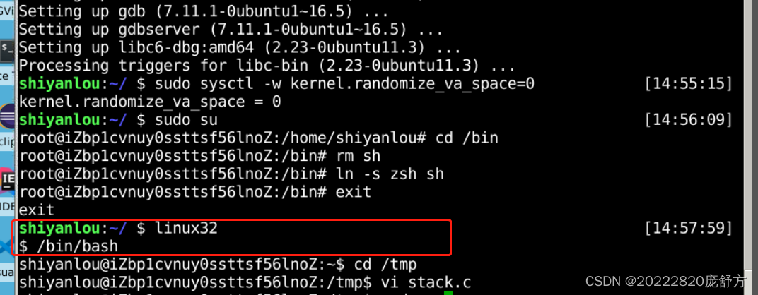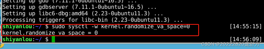 1、Ubuntu 和其他一些 Linux 系统中,使用地址空间随机化来随机堆(heap)和栈(stack)的初始地址,这使得猜测准确的内存地址变得十分困难,而猜测内存地址是缓冲区溢出攻击的关键。因此本次实验中,我们使用以下命令关闭这一功能: