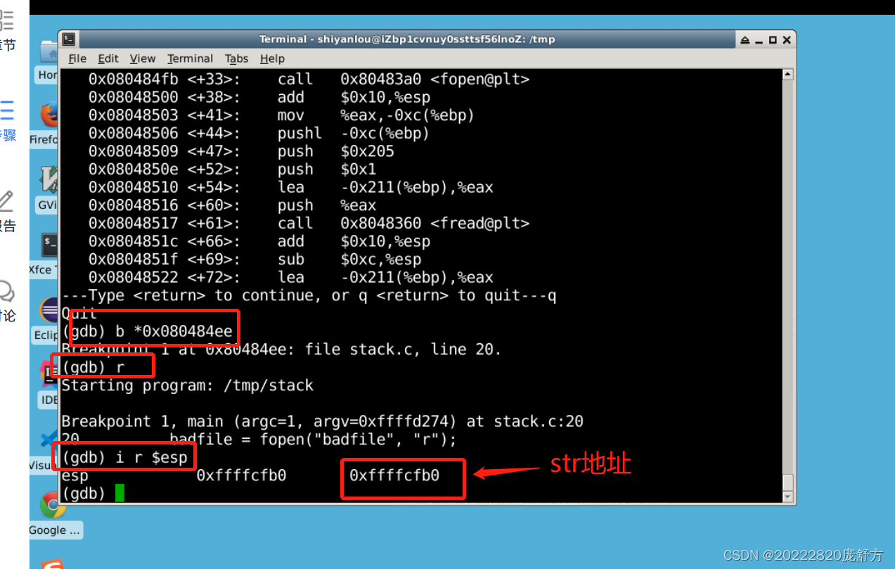 现在我们要得到 shellcode 在内存中的地址,输入命令进入 gdb 调试: