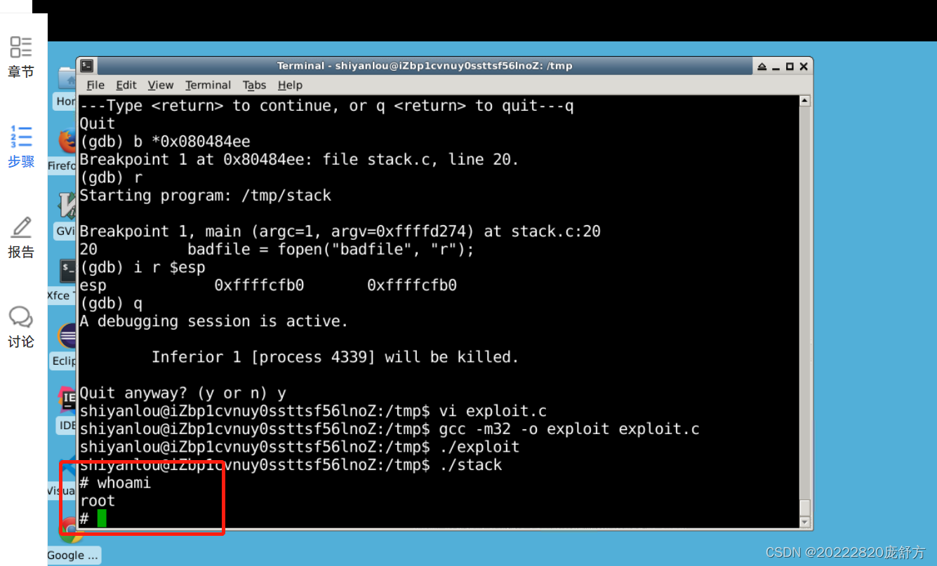 我们的目的是攻击刚才的漏洞程序,并通过攻击获得 root 权限。