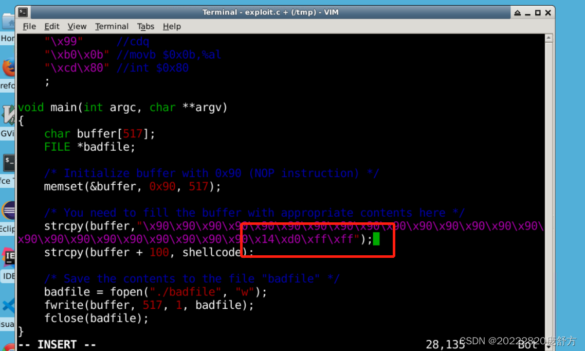 现在修改 exploit.c 文件,将 \x??\x??\x??\x?? 修改为计算的结果 \x14\xd0\xff\xff,注意顺序是反的。