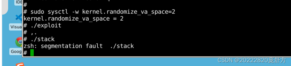 1. 通过命令 sudo sysctl -w kernel.randomize_va_space=2 打开系统的地址空间随机化机制,重复用 exploit 程序攻击 stack 程序,观察能否攻击成功,能否获得root权限。