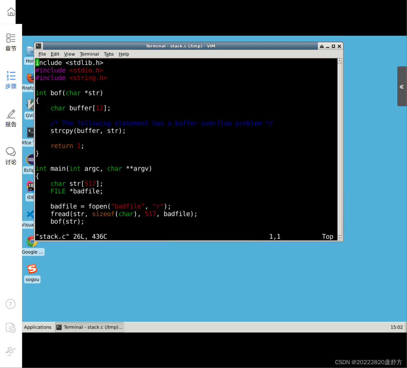 通过代码可以知道,程序会读取一个名为“badfile”的文件,并将文件内容装入“buffer”。