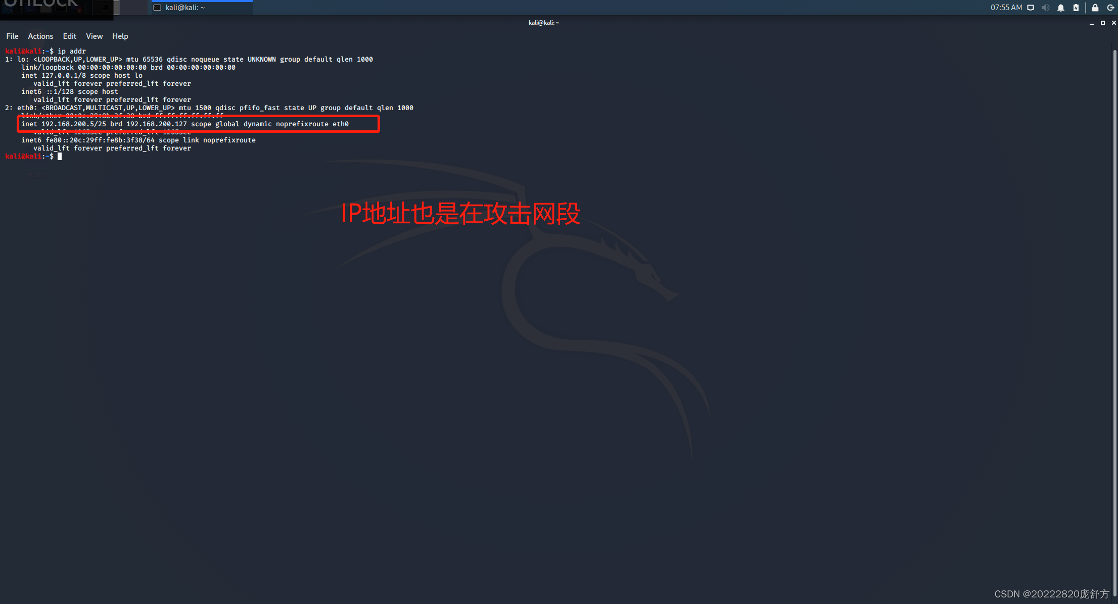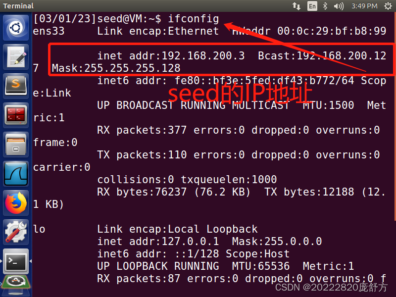 在Ubuntu虚拟机中打开终端,查询seed的IP地址,在攻击网段,其他两个IP地址也在攻击网段。