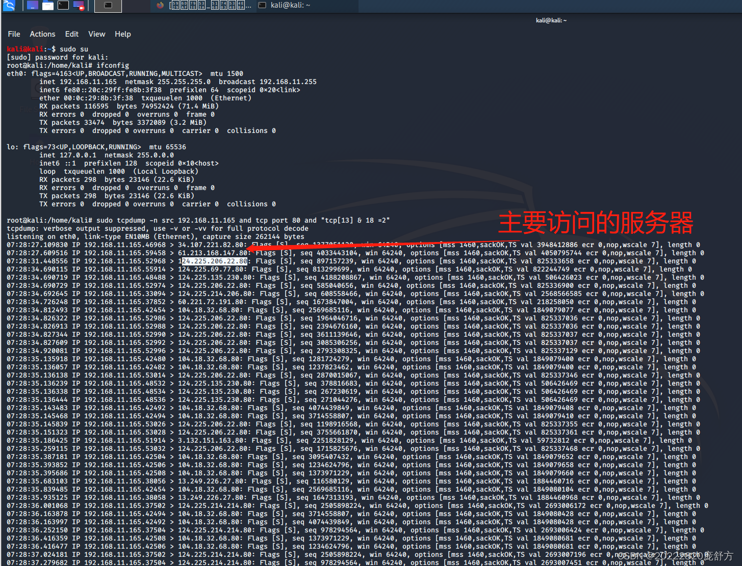 使用tcpdump开源软件对在本机上访问www.tianya.cn网站过程进行嗅探,回答问题:你在访问www.tianya.cn网站首页时,浏览器将访问多少个Web服务器?他们的IP地址都是什么?
