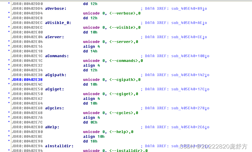 脱壳,直接到利用IDA Pro进行分析。首先把Type改成unicode类型,看到下面几种字符串。