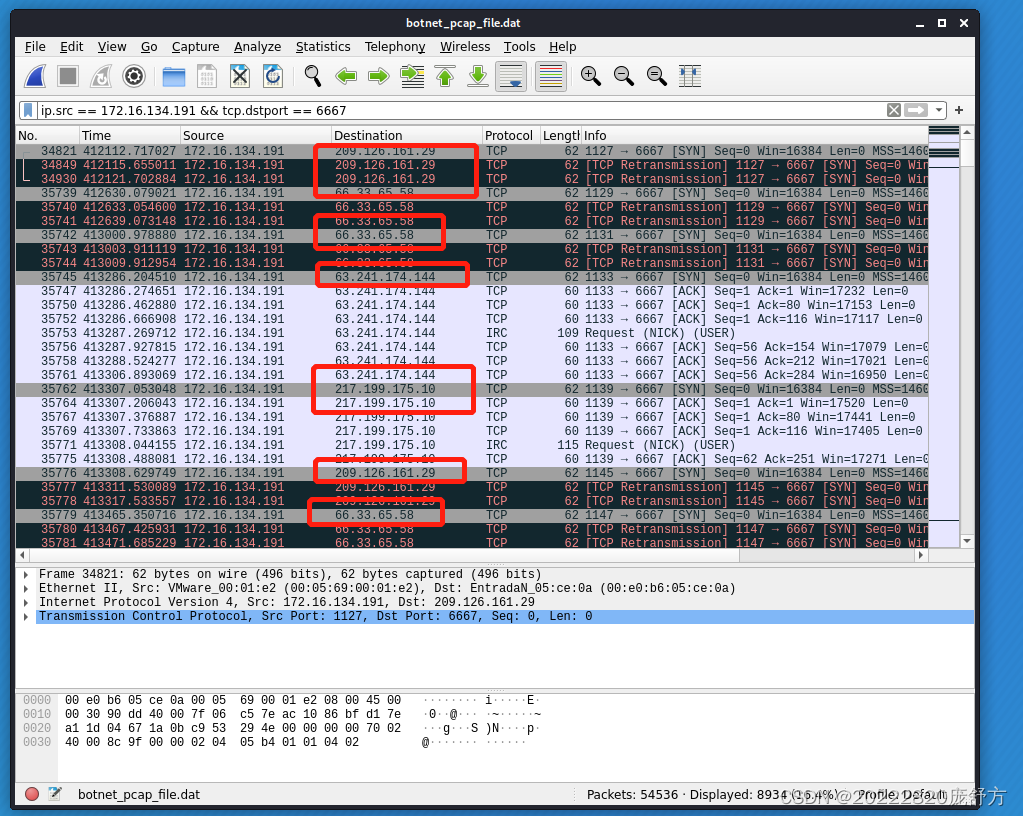 答:使用Wireshark打开数据文件,并设置过滤条件ip.src == 172.16.134.191 && tcp.dstport == 6667,因为我们上面的分析知道IRC通过6667端口,筛选之后,我们可以找到五个IRC服务器,分别为:209.126.161.29、66.33.65.58、63.241.174.144、217.199.175.10、209.196.44.172