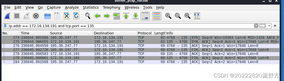 ip.addr == 172.16.134.191 and tcp.port == 135 筛选端口135的数据。可看出端口135的数据很少,且并没有实际数据交互,推测是在探测。