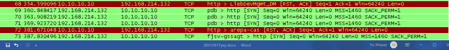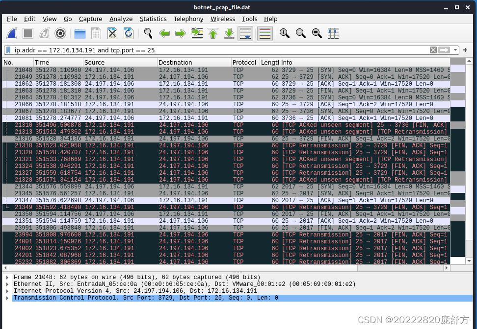 - 答:(1)使用snort -r botnet.pcap -c /etc/snort/snort.conf -K ascii指令先查一下网络流分布情况,发现大部分都是TCP包,有一部分UDP包,利用tcpdump -r botnet_pcap_file -nn 'src host 172.16.134.191' and tcp[tcpflags]== 0x12 | cut -d ' ' -f 3 | cut -d '.' -f 5 | sort | uniq指令筛选出蜜罐主机相应的TCP端口。