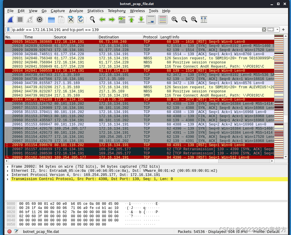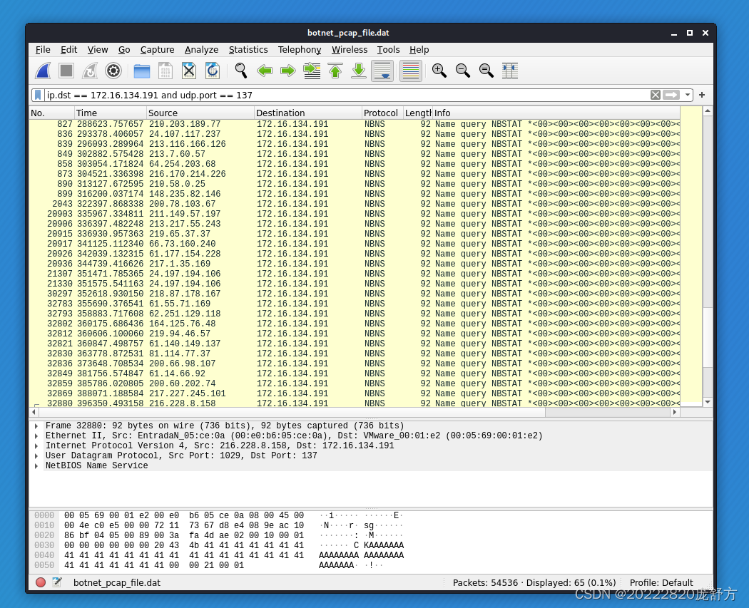 分析UDP的137端口,这个端口是NetBIOS相关协议,ip.dst == 172.16.134.191 and udp.port == 137。可以看到这里的所有IP地址进行访问的负载都是相同的,都是KAAAAA....AA的形式,这里推测应该是在进行NetBIOS查点