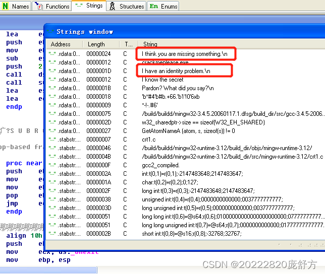 分析crackme2.exe同样使用IDA Pro打开crackme2.exe,在string窗口中可以看到有反馈