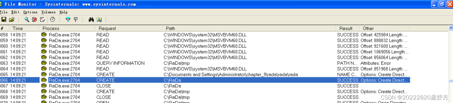开Filemon(文件),Regmon(注册表),Wireshark(网络)三个软件进行监测,然后在cmd窗口运行RaDa.exe。观察Filemon我们可以看到程序文件RaDa.exe复制到了C:\RaDa\bin目录下,并且新建了temp目录。