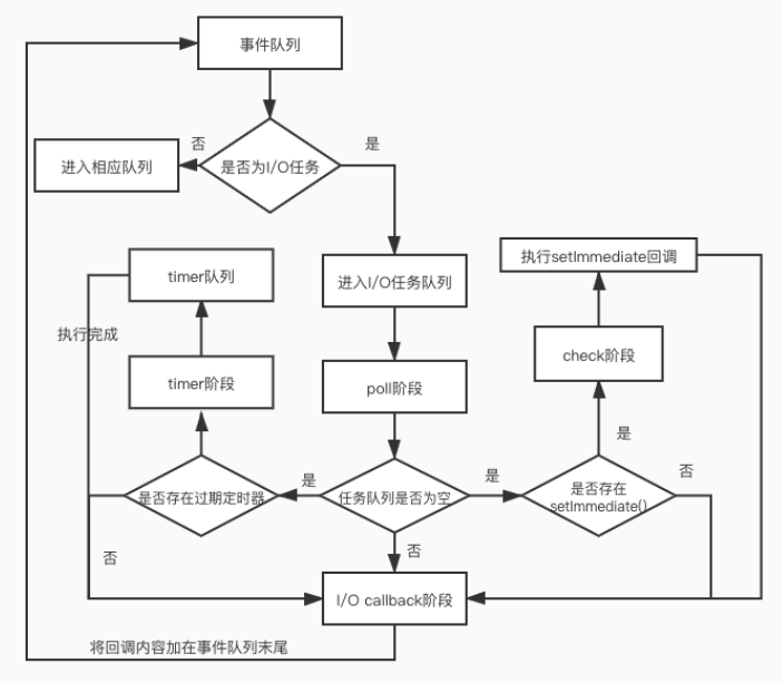 每个阶段对应一个队列,当事件循环进入某个阶段时, 将会在该阶段内执行回调,直到队列耗尽或者回调的最大数量已执行, 那么将进入下一个处理阶段