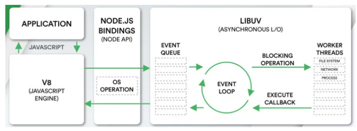 而在NodeJS中,事件循环是基于libuv实现,libuv是一个多平台的专注于异步IO的库,如下图最右侧所示: