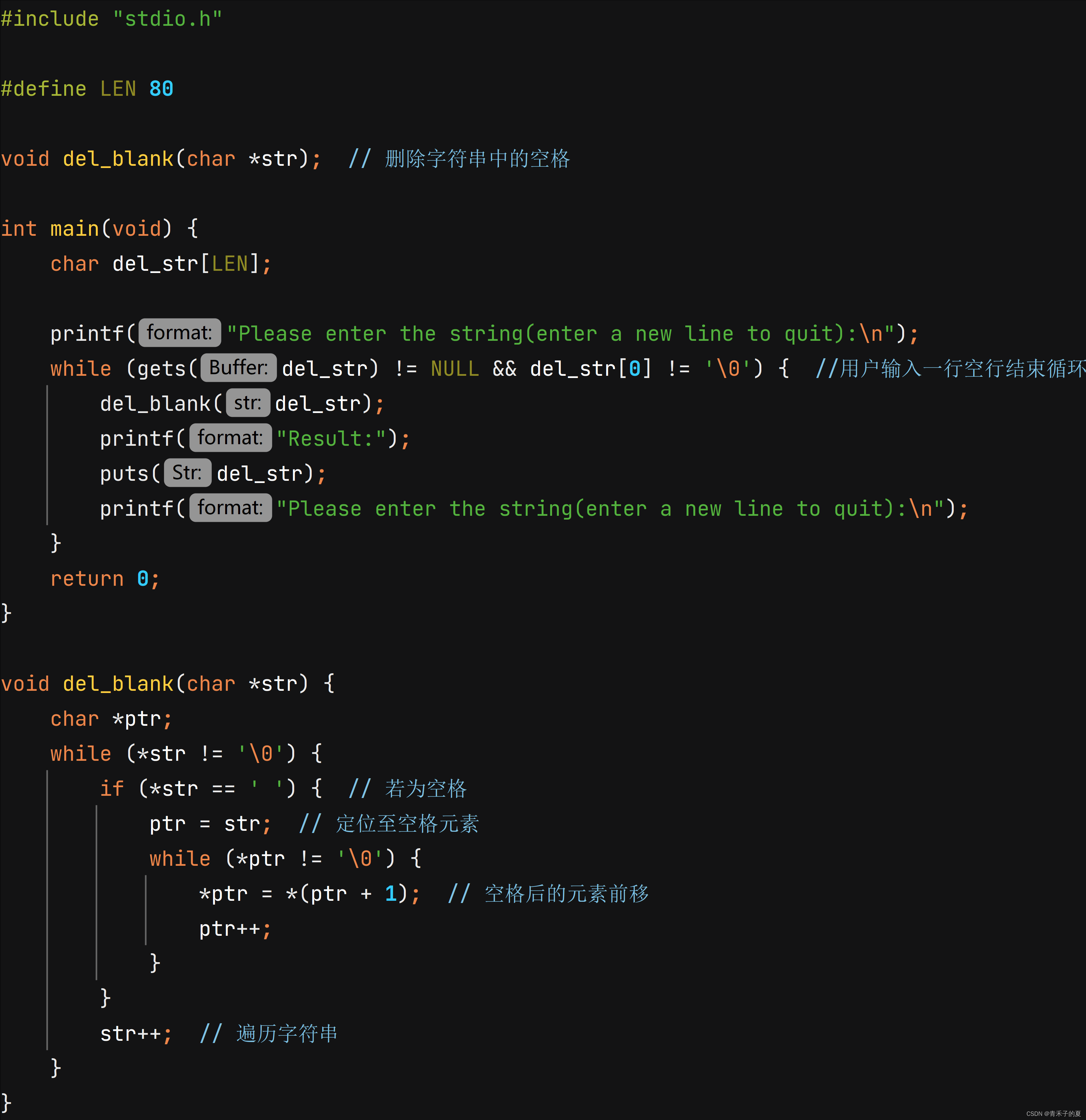 编写一个函数接受一个字符串作为参数,并删除字符串中的空格。在一个程序中测试该函数,使用循环读取输入行,直到用户输入一行空行。该程序应该应用该函数读取每个输入的字符串,并显示处理后的字符串。