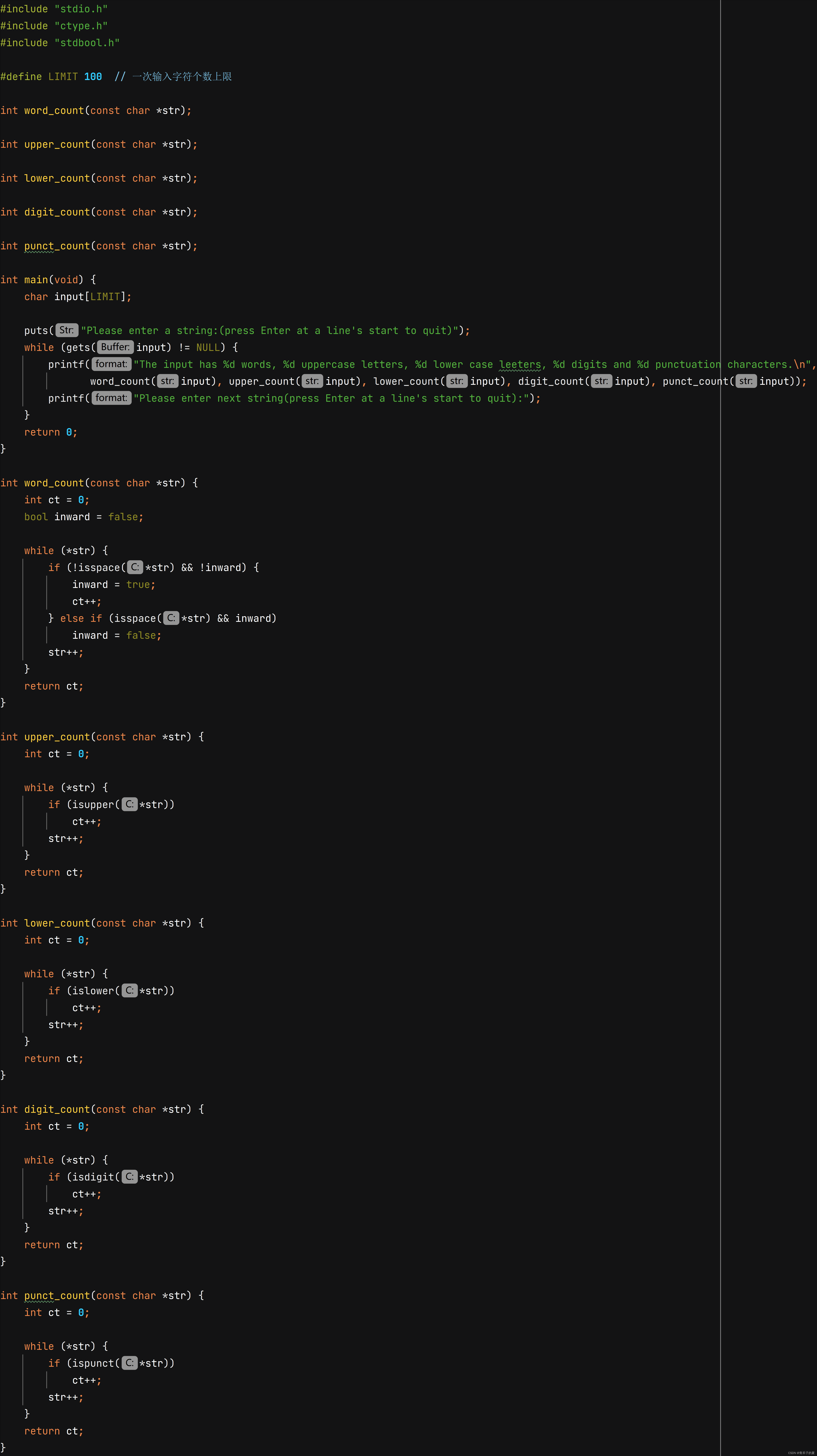 编写一个程序,读取输入,直至读到 EOF,报告读入的单词数、大写字母数、小写字母数、标点符号数和数字字符数。使用ctype.h头文件中的函数。 直接使用if...else...结构也可以,写成单个函数有利于模块化。