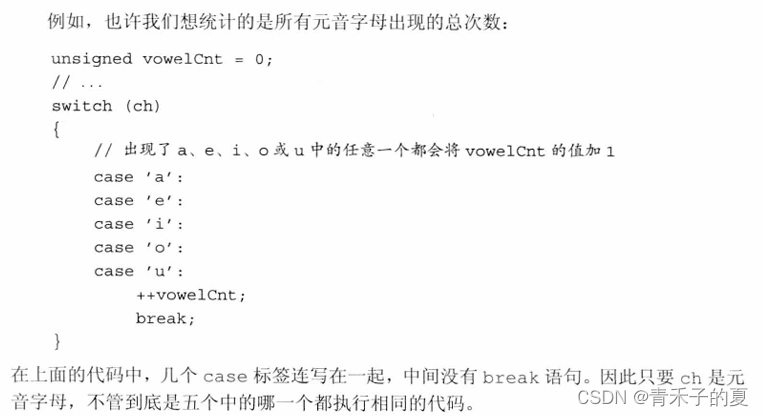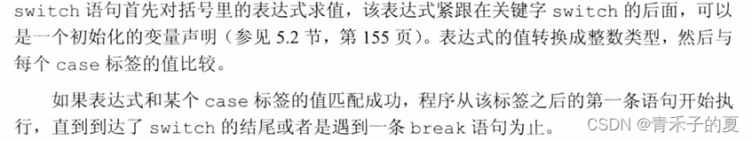 如果某个case标签匹配成功,将从该标签开始往后顺序执行所有case分支,除非程序显式地中断了这一过程(如break语句),否则知道switch的结尾处才会停下来。