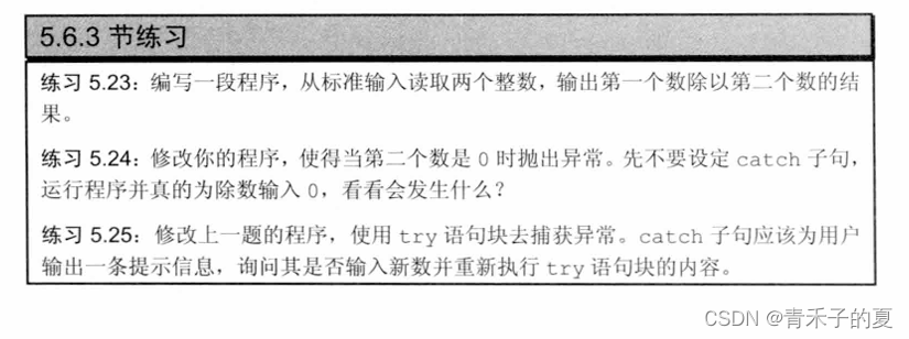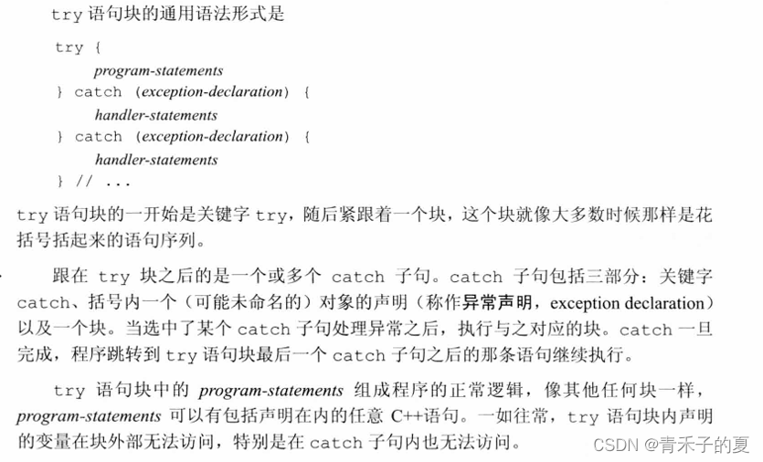 ② try语句块(try block),异常处理部分使用try语句块处理异常。try语句块以关键字try开始,并以一个或多个catch子句结束。try语句块中代码抛出的异常通常会被某个catch子句处理。因为catch子句“处理”异常,所以它们也被称作异常处理代码。
