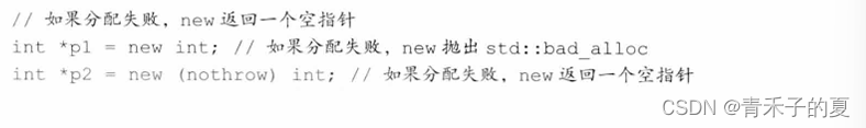 我们称这种形式的new为定位new(placement new)。定位new表达式允许我们向new传递额外的参数。在此例中,我们传递给它一个由标准库定义的名为nothrow的对象。如果nothrow传递给new,我们的意图是告诉它不能抛出异常。bad_alloc和nothrow都定义在头文件new中。