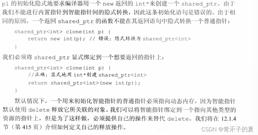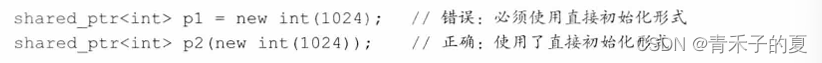 接受指针参数的智能指针构造函数是explicit的。因此,我们不能将一个内置指针隐式转换为一个智能指针,必须使用直接初始化形式来初始化一个智能指针。