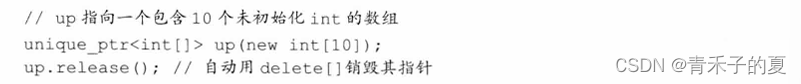 标准库提供了一个可以管理new分配的数组的unique_ptr版本。为了用一个unique_ptr管理动态数组,我们必须在对象类型后面跟一对空方括号: