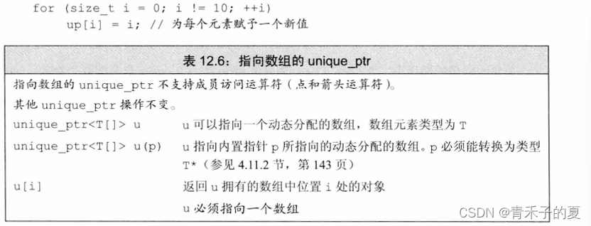当一个unique_ptr指向一个数组时,我们不能使用点和箭头成员运算符,但可以使用下标运算符来访问数组中的元素。