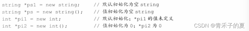 默认情况下,动态分配的对象是默认初始化的,这意味着内置类型或组合类型的对象的值将是未定义的,而类类型对象将用默认构造函数进行初始化: