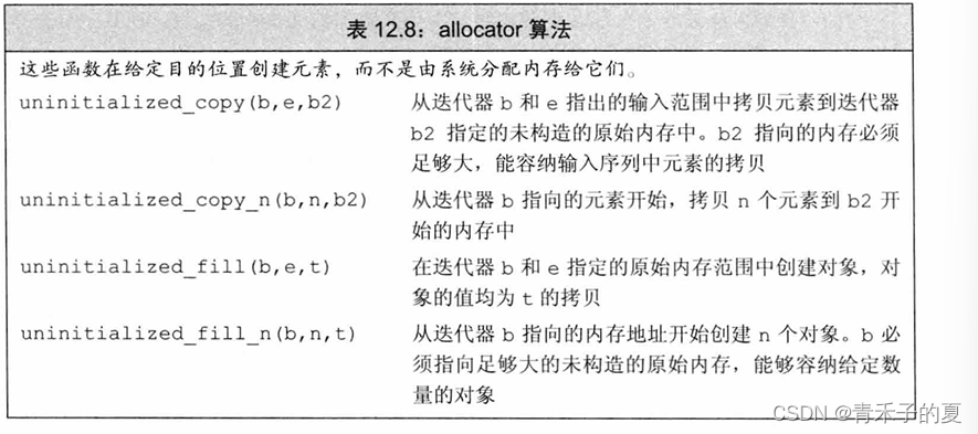 标准库为allocator类定义了两个伴随算法,可以在未初始化内存中创建对象。它们定义在头文件memory中。这些函数返回(递增后的)目的位置迭代器。