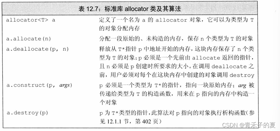 C++语言定义了另一种new表达式语法,可以分配并初始化一个对象数组。标准库中包含一个名为allocator的类,允许我们将分配和初始化分离。使用allocator通常会提供更好的性能和更灵活的内存管理能力。