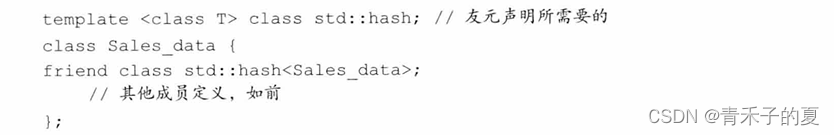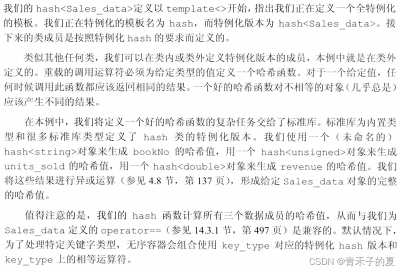 举例:为标准库hash模板定义一个特例化版本,可以用它来将Sales_data对象保存在无序容器中。默认情况下,无序容器使用hash<key_type>来组织元素。为了让我们自己的数据类型也能使用这种默认组织方式,必须定义hash模板的一个特例化版本。一个特例化hash类必须定义: