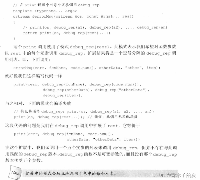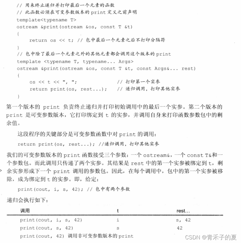 可变参数函数通常是递归的。第一步调用处理包中的第一个实参,然后用剩余实参调用自身。