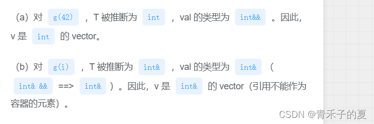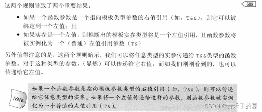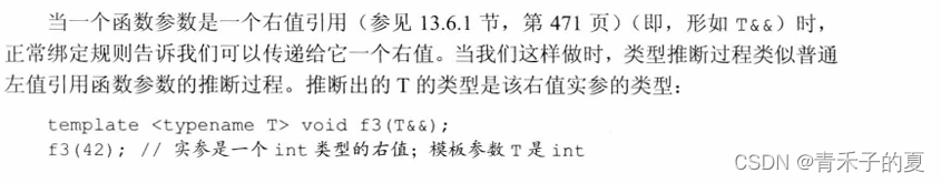 第一个例外规则:当我们将一个左值(如i)传递给函数的右值引用参数,且此右值引用指向模板类型参数(如T&&)时,编译器推断模板类型参数为实参的左值引用类型。因此当我们调用f3(i)时,编译器推断T的类型为int&,而非int。