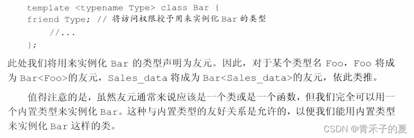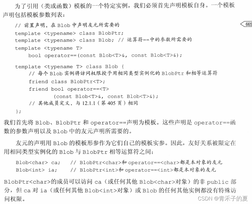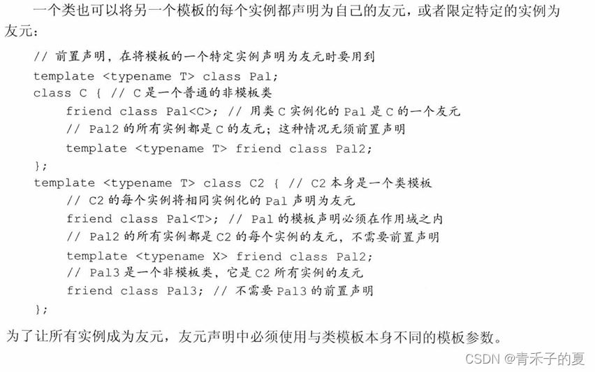 当一个类包含一个友元声明时,类与友元各自是否是模板是相互无关的。如果一个类模板包含一个非模板友元,则友元被授权可以访问所有模板实例。如果友元本身是模板,类可以授权给所有友元模板实例,也可以只授权给特定实例。