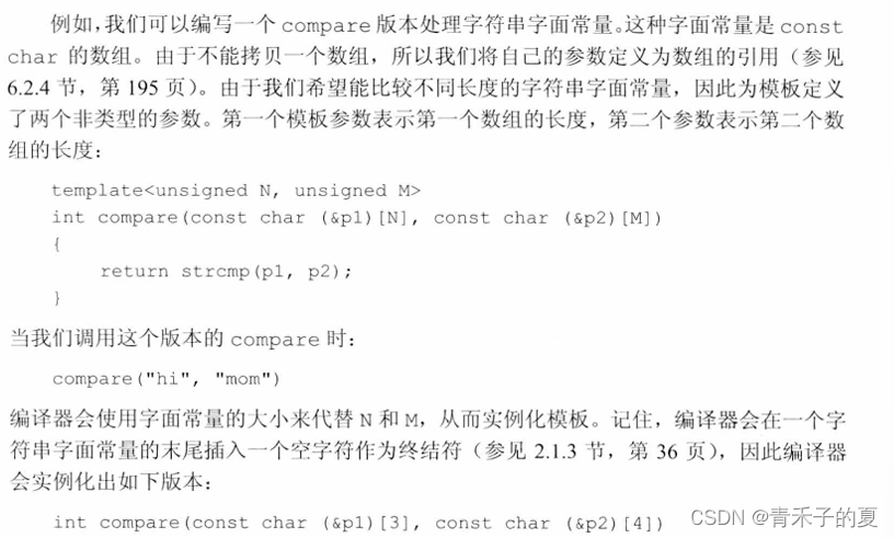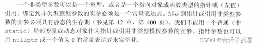 当一个模板被实例化时,非类型参数被一个用户提供的或编译器推断出的值所代替。这些值必须是常量表达式,从而允许编译器在编译时实例化模板。