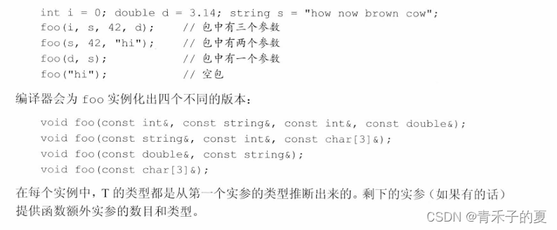 与往常一样,编译器从函数的实参推断模板参数类型。对于一个可变参数模板,编译器还会推断包中参数的数目。
